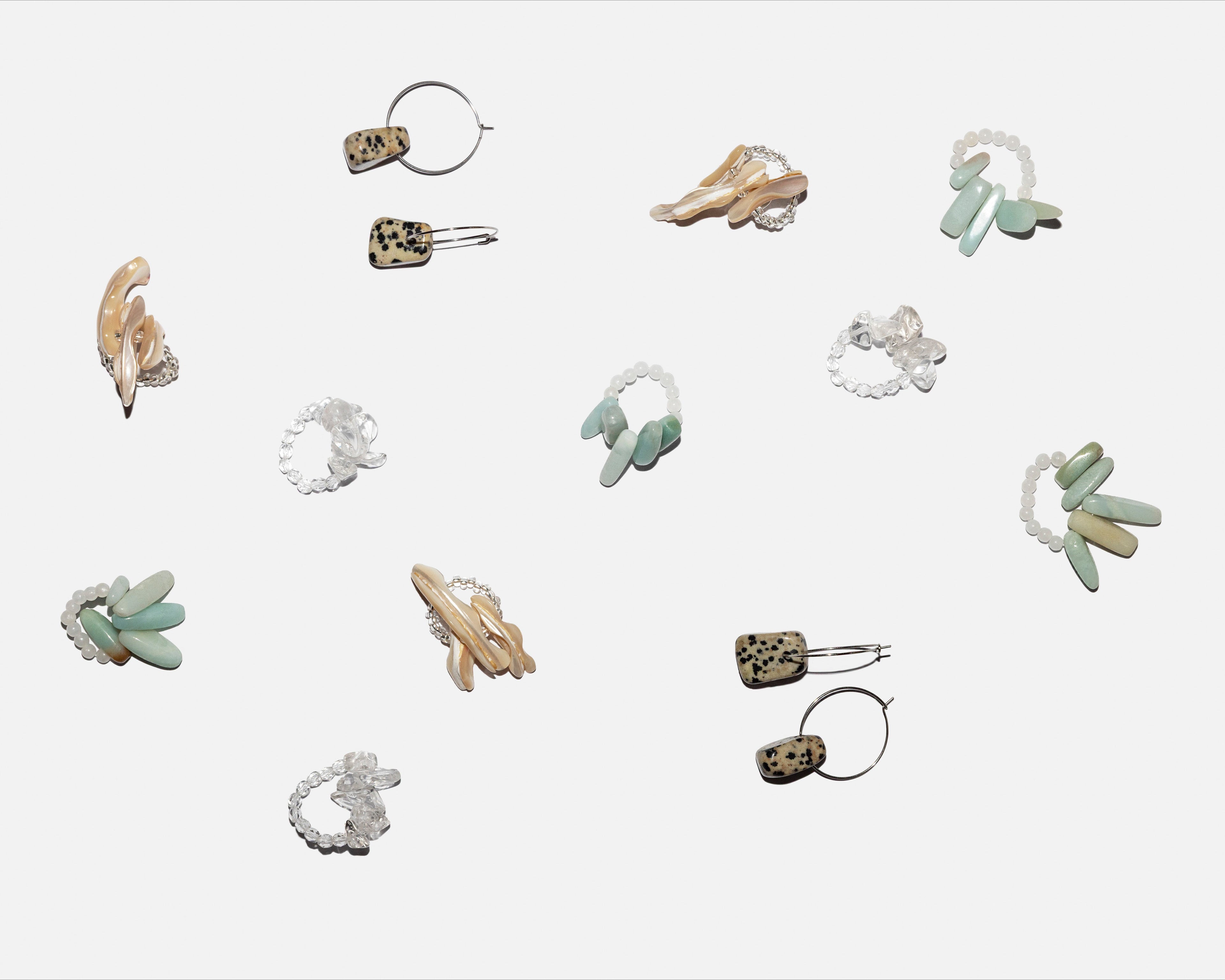 Explore the the newest statement jewellery made from deadstock glass beads and various kinds of semi-precious stone and mother of pearl.
