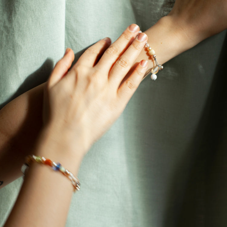 The Kaaret Val collection of jewellery is made from vintage, second hand and dead stock glass and plastic beads. The beads used in this collection have all been searched personally by Klára Dudáková, the designer behind Kaaret and come from different backgrounds.