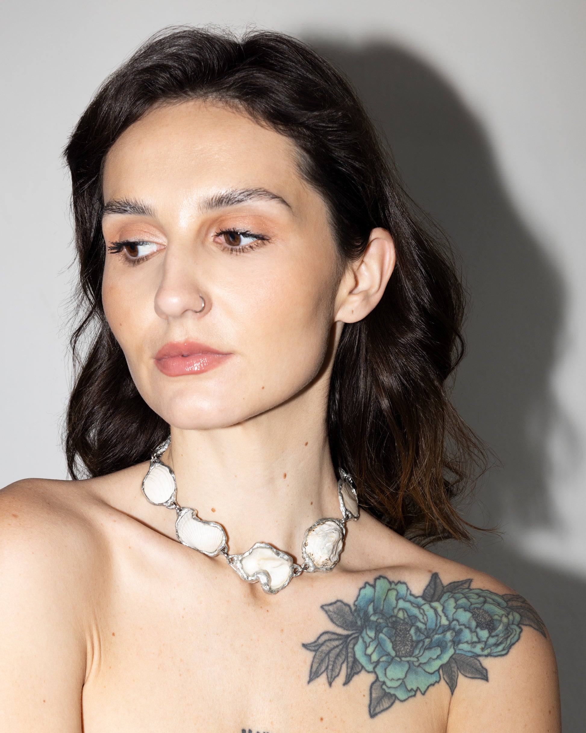Statement necklace with with fragments of shells. One-of-a-kind, only one piece available.