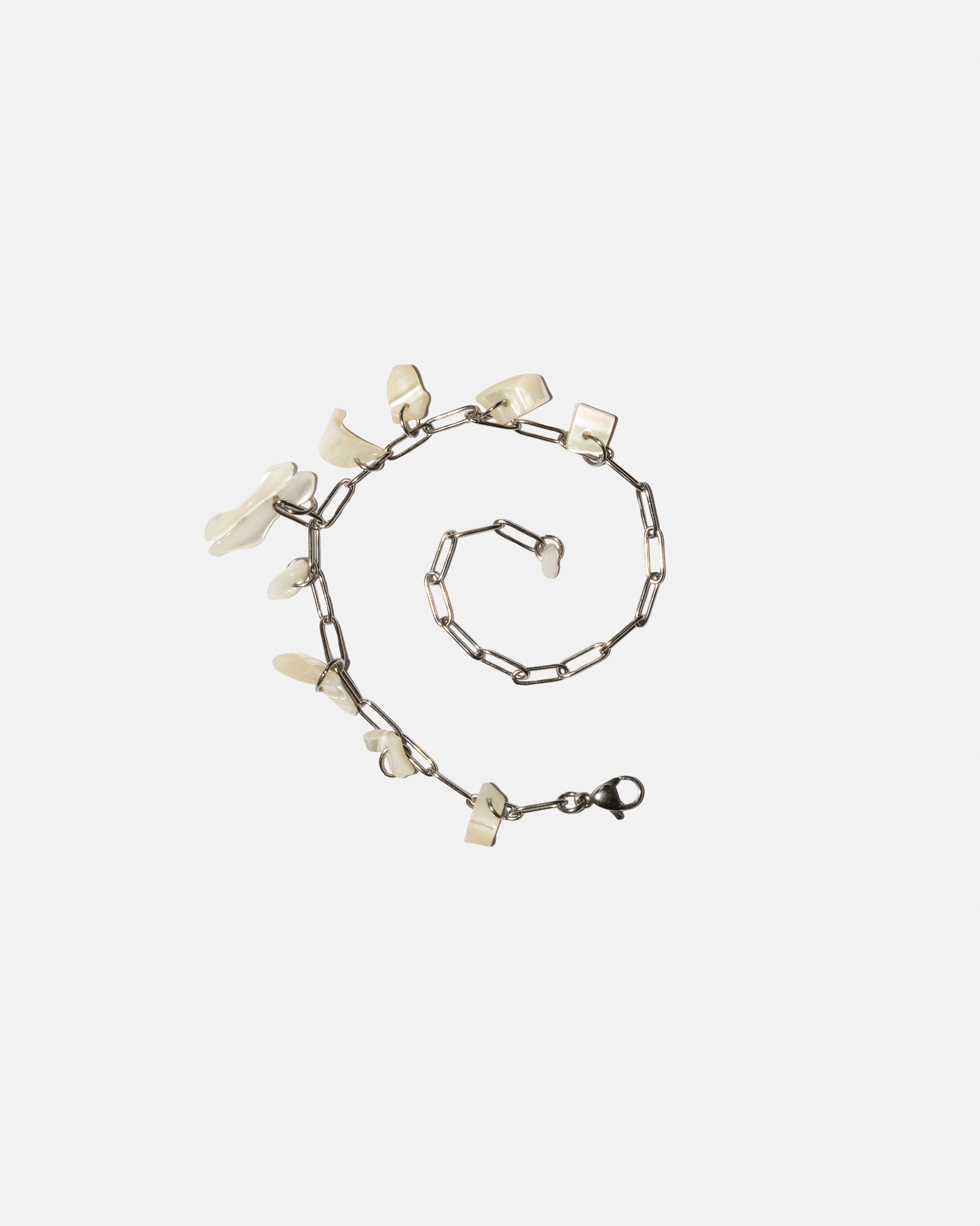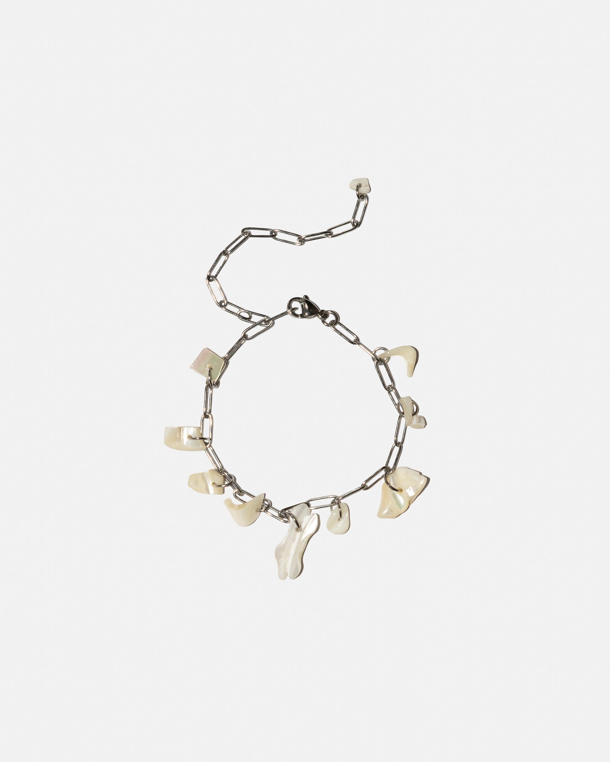 Lightweight bracelet with vintage mother-of-pearl fragments hanging from a stainless steel chain.