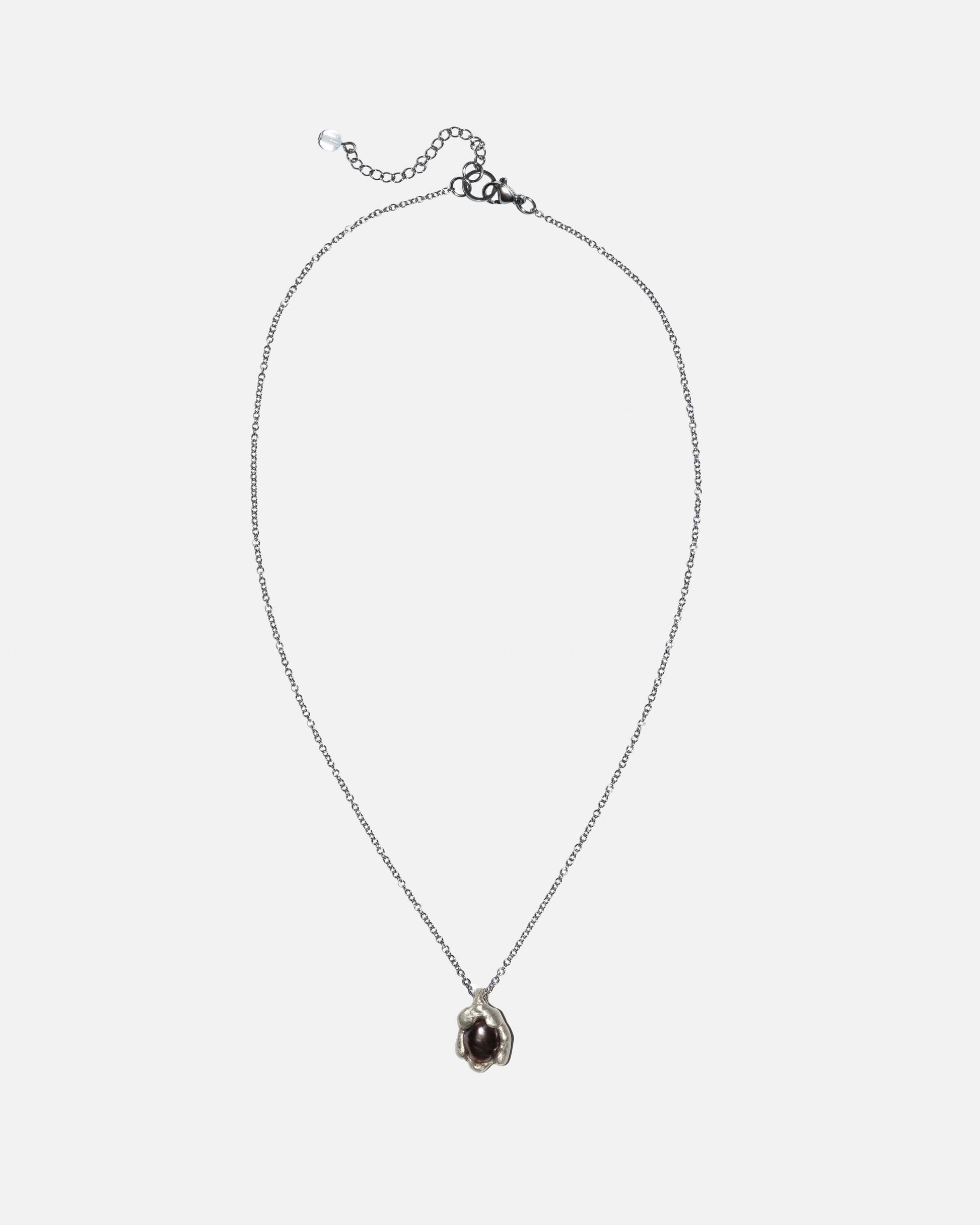 Minimalistic necklace with dark freshwater pearl charm encased in frame resembling dripping mud.