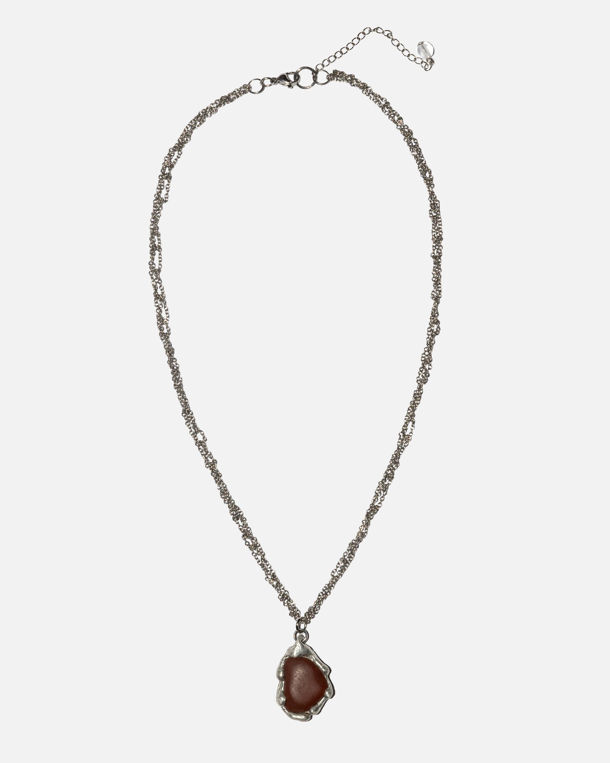 Hand-crocheted stainless steel necklace with pebble stone in deep brown-burgundy color encased in soldered frame resembling dripping mud.